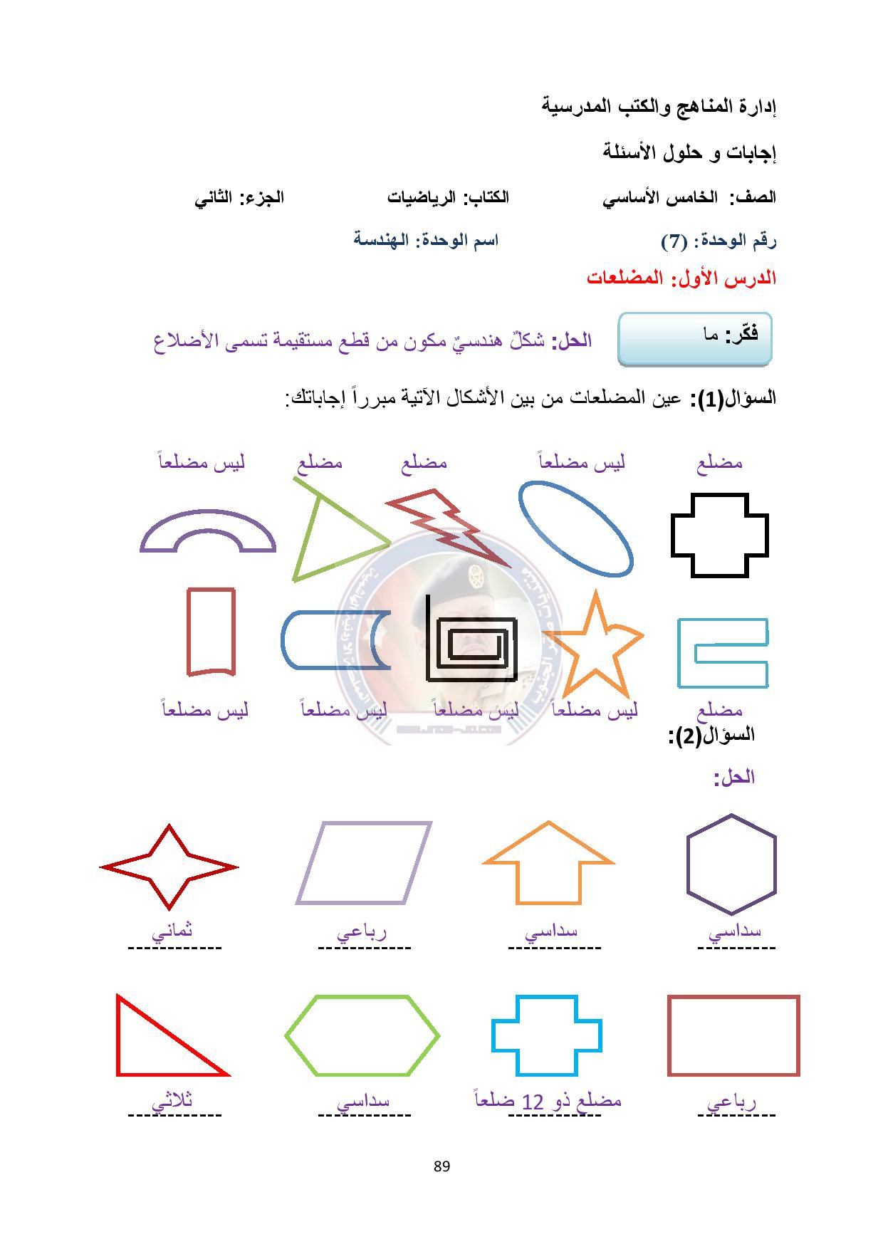 بالصور اجابات مادة الرياضيات الوحدة السابعة الهندسة للصف الخامس الفصل الثاني منتديات صقر الجنوب