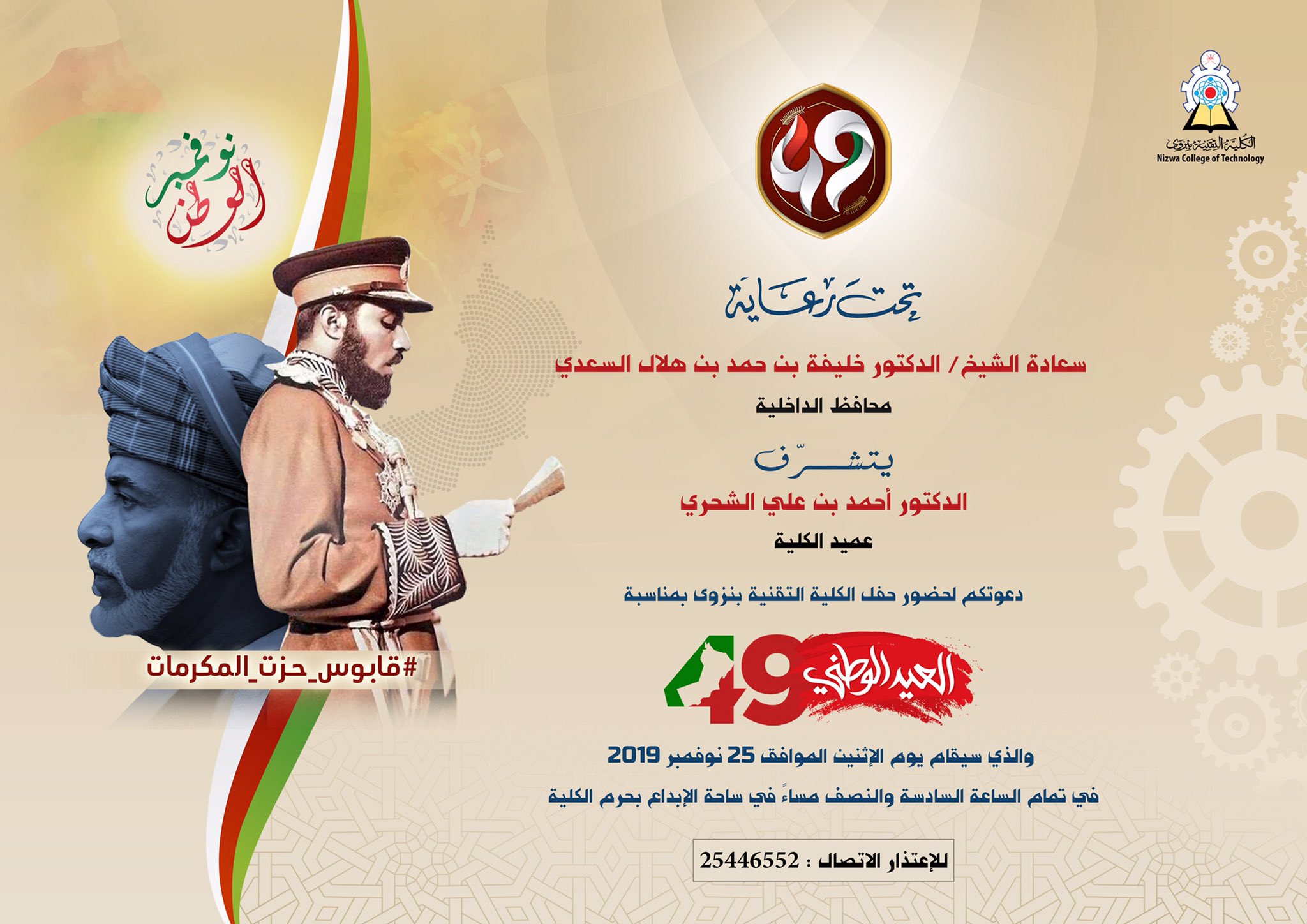 جامعة التقنية والعلوم التطبيقية تقنية نزوى Pa Twitter دعوة لحضور حفل الكلية التقنية بنزوى بمناسبة العيد الوطني ال49 المجيد الأمسية الوطنية حكاية عمان تقنية نزوى قابوس حزت المكرمات نوفمبر49 سلطنه وسلطان Https T Co Ryf2dyo1eh