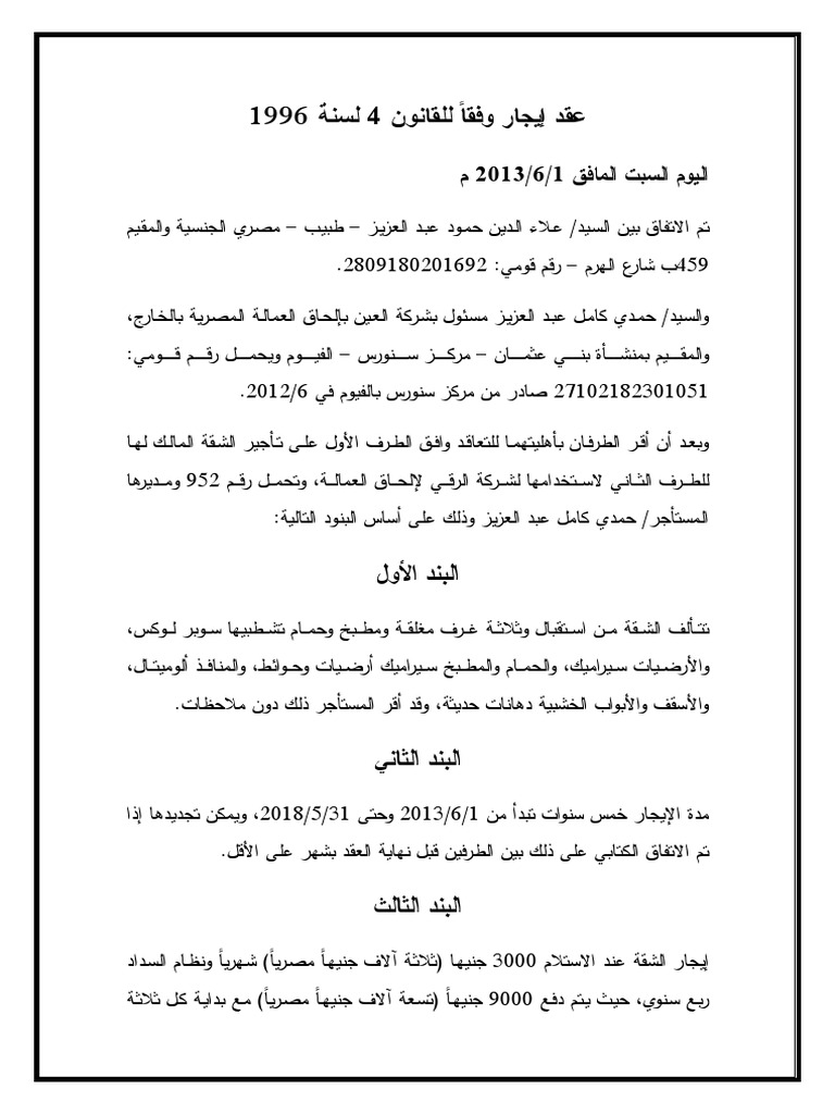 صيغة ونموذج عقد ايجار املاك خاضع لأحكام القانون 4 لسنة 1996